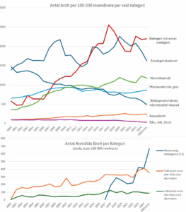 Mord och sprängningar skapar rubriker, men mord, både med och utan skjutvapen minskar nu. Brott under rubriken allmänfarlig ödeläggelse ökar dock. Bedrägerier och narkotikabrott anmäls oftare, inbrott och rån anmäls mindre, men misshandelsfall går upp igen efter en stadig nedgång.